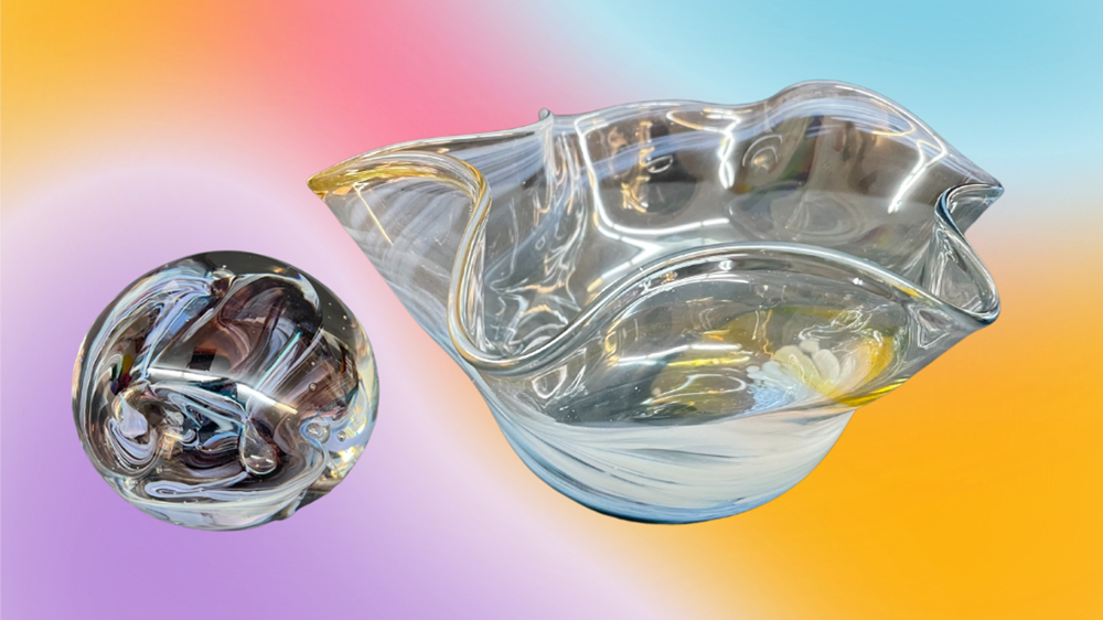 Decorate your home or office with these beautifully handblown glass works from Learning Community’s very own art teacher, Dana Pomerantz! This custom wavy vase and paperweight are functional and decorative. What’s not to love!